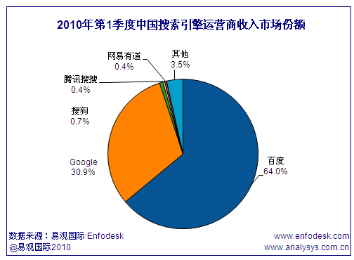 根據(jù)易觀國(guó)際Enfodesk產(chǎn)業(yè)數(shù)據(jù)庫(kù)《2010年第1季度中國(guó)搜索引擎市場(chǎng)季度監(jiān)測(cè)》顯示,百度、Google仍然占據(jù)市場(chǎng)主要地位。