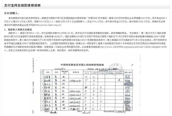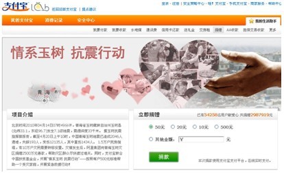 2010年以來,支付寶聯手中國扶貧基金會等慈善機構在支付寶網站開通了專門的捐贈頻道,僅在過去一個多月時間里,支付寶就發起了“救助西南旱災”、“思源水窖行動”以及“抗擊玉樹地震”等多個慈善捐款項目,號召網友和用戶通過支付寶賬戶捐款。